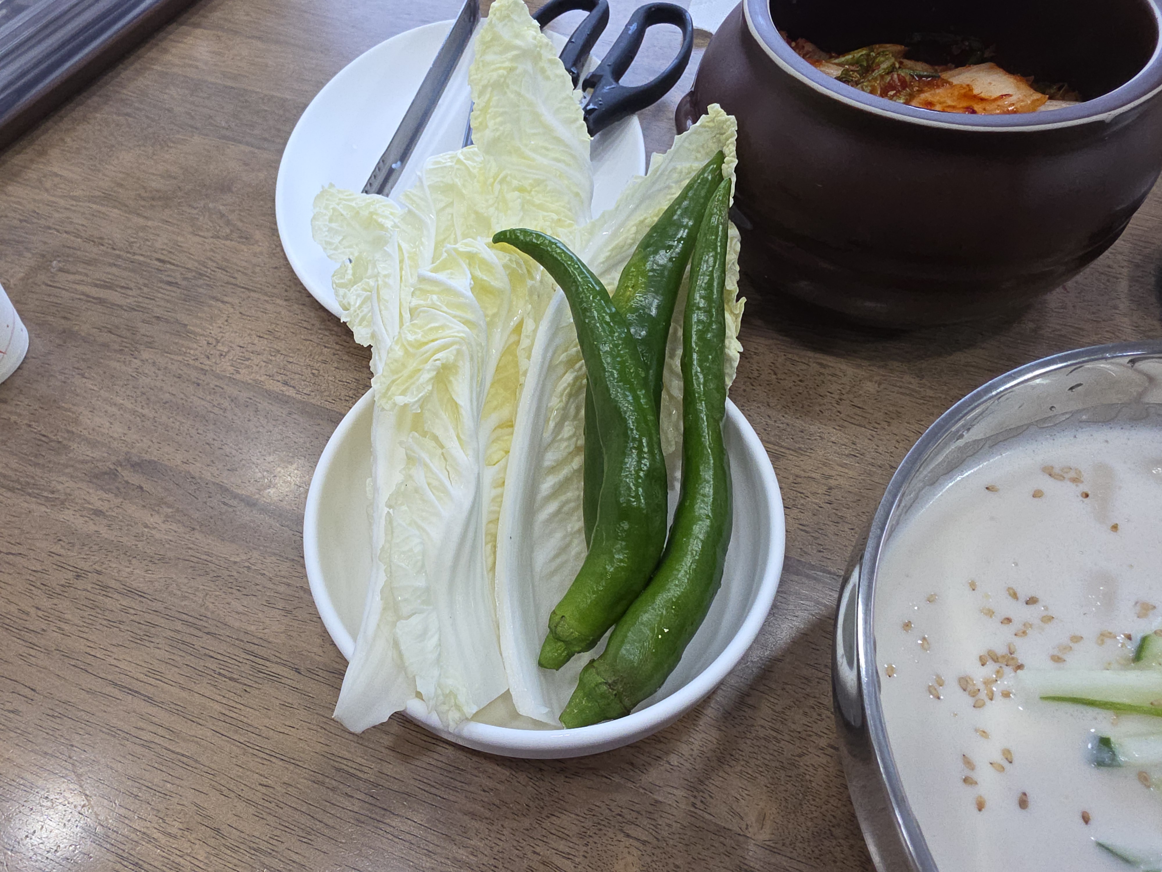 겉절이, 고추, 알배기 배추, 소금, 고추장 기본 반찬이고요. 얼음 동동 콩국수가 메인이예요.